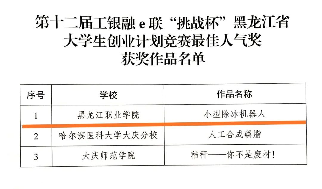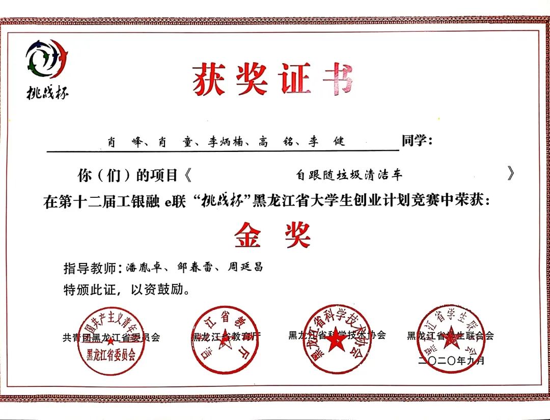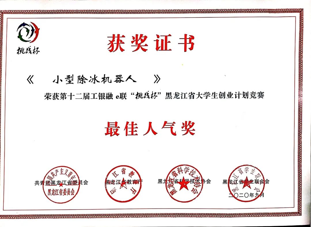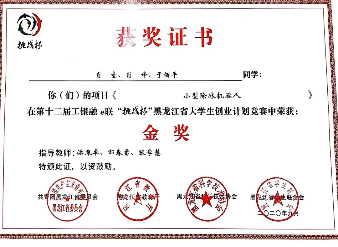 9月8日,团省委、省教育厅、省科学技术协会、省学生联合会联合印发了《关于表彰第十二届工银融e联“挑战杯”黑龙江省大学生创业计划竞赛获奖集体和个人的决定》(黑青联字[2020]13号)文件,在全省各高校209件作品入围决赛的作品中,金年会参赛项目荣获大赛金奖4项、银奖2项、铜奖3项,有3项作品被推荐至国赛,由机械工程学院潘胤卓老师指导、肖童同学负责的《小型除冰机器人》项目以总票数排名第一的成绩荣获“最佳人气奖”,金年会荣膺大赛“优胜杯”,创造了金年会“挑战杯”参赛史最佳成绩。