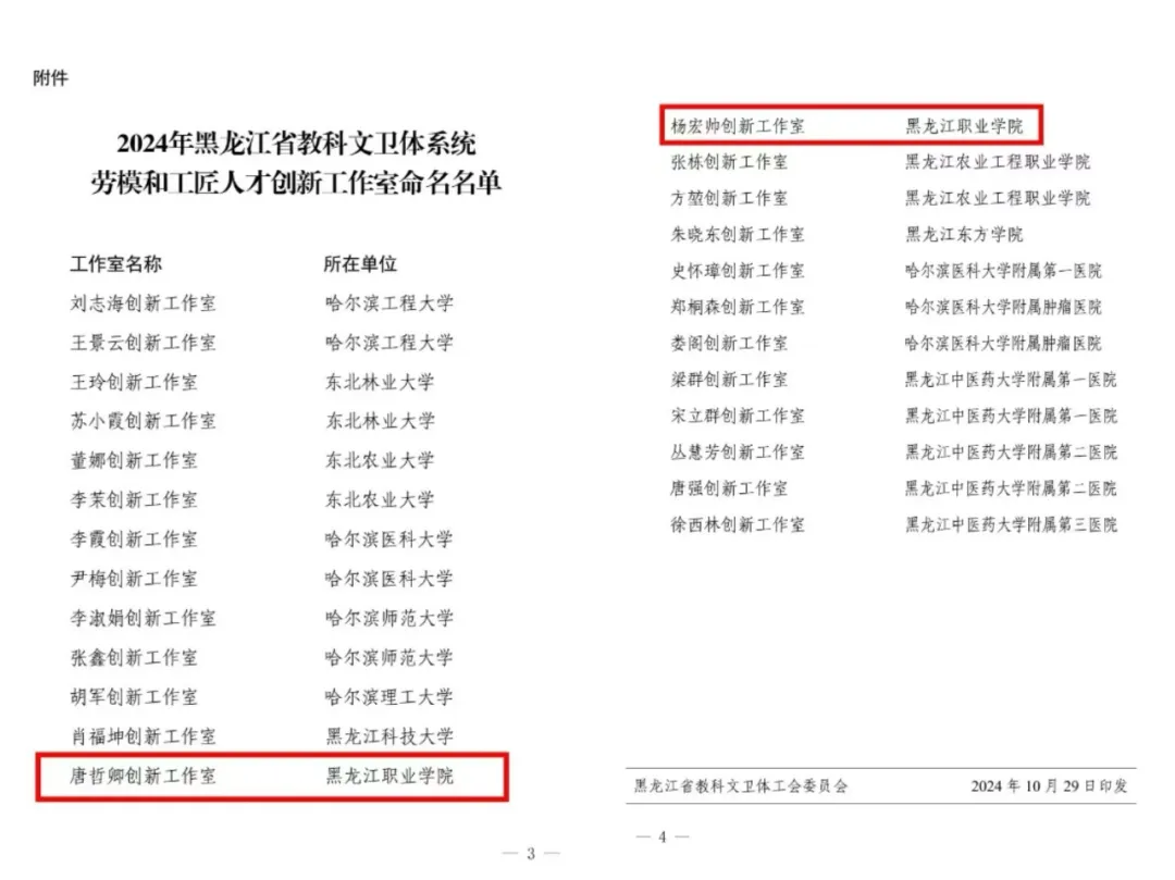 近日,省教科文卫体工会下发《关于命名2024年黑龙江省教科文卫体系统劳模和工匠人才创新工作室的决定》,全省共25个工作室获评省教科文卫体系统劳模和工匠人才创新工作室,金年会唐哲卿创新工作室、杨宏帅创新工作室获此殊荣。