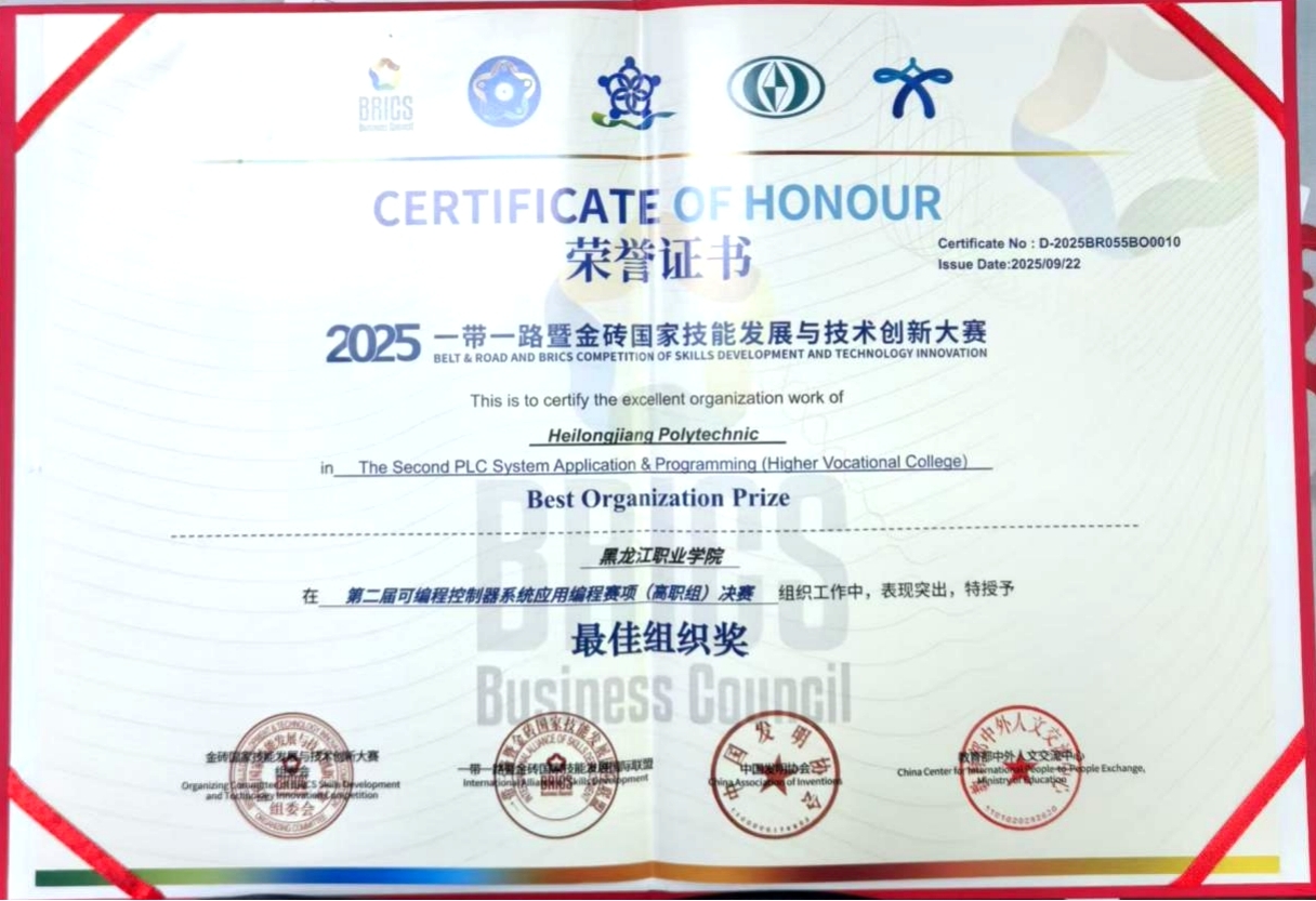 2025年“一带一路”暨金砖国家技能发展与技术创新大赛第二届可编程控制器系统应用编程赛项于9月20日在黔西南民族职业技术学院举办,来自136支高职院校队伍和41支中职院校队伍参加,通过理论和实践等环节比拼,智能制造技术学院徐伟老师指导的学生曲云辉凭借着扎实的技术功底,在众多选手中脱颖而出,全国排名第9名,斩获金牌,实现金年会在此赛事的新突破。大赛委员会为金年会颁发了最佳组织奖,对金年会组织备赛、参赛给予了充分肯定。