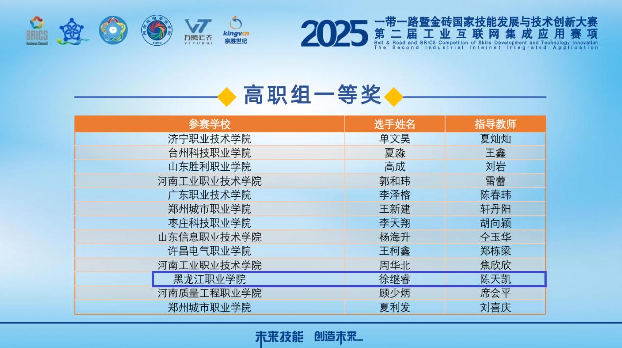 同时,2025年“一带一路”暨金砖国家技能发展与技术创新大赛第二届工业互联网集成应用赛项于9月14日开赛,本次大赛吸引了全国133所高职学校,共392支队伍参赛。智能制造技术学院物联网应用技术专业陈天凯老师指导学生徐继睿经过激烈角逐,全国排名第11位,斩获金牌,实现金年会在此赛事的新突破。