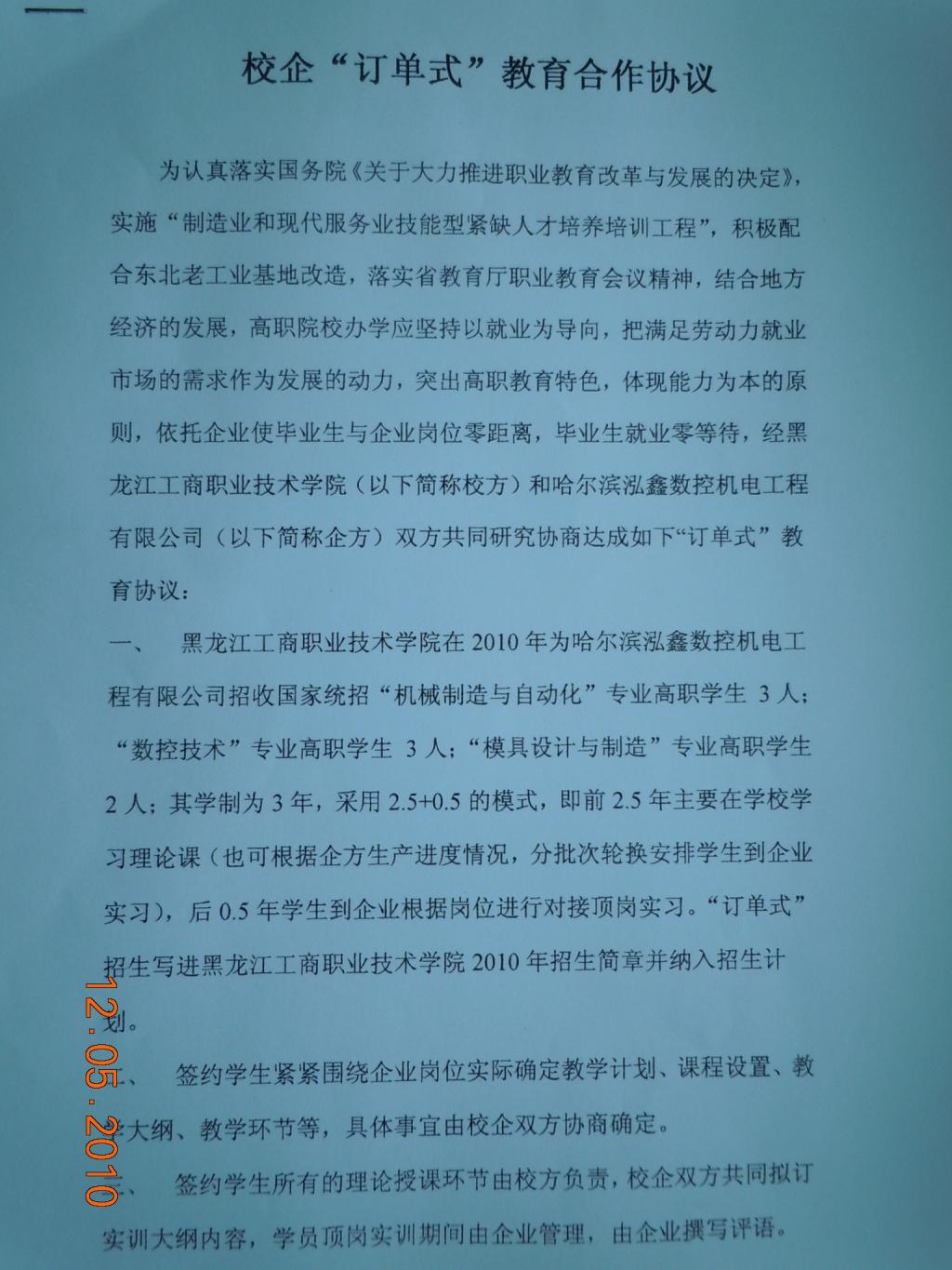 哈尔滨轰鑫数控机电工程有限公司校企“订单式”教育合作协议