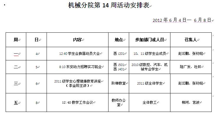 机械分院第十四周重点工作推进表