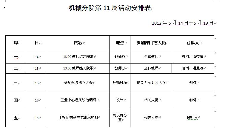 机械分院第十一周重点工作推进表