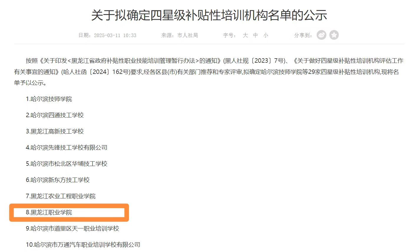 近日,哈尔滨市人力资源和社会保障局公示了《关于拟确定四星级补贴性培训机构名单》,金年会成功入选哈尔滨市四星级补贴性培训机构。