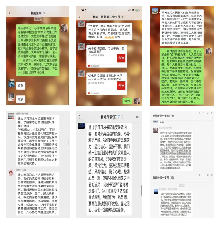 针对当前疫情情况,智能制造技术学院党总支及时创新主题党日活动形式,打破时间和空间限制。党员同志们在“线上”集结,党总支在钉钉群内商讨及制定学习主题及内容,在各支部微信群里以“分享学习资料+交流心得体会”的形式进行学习。为丰富学习内容,智能制造技术学院党总支建立“党员线上学习教育资料库”。库里跟进收集了习近平总书记最新讲话、批示指示精神,以及党纪党规、党务知识等党建基本常识。这成了机关党员的线上“精神加油站”。