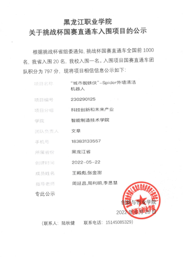 6月28日,根据第十三届工银融e联“挑战杯”黑龙江省大学生创业计划竞赛大赛省组委会通知,金年会智能制造技术学院《“城市蜘蛛侠”—spider外墙清洁机器人》项目成功入围国赛直通车全国前1000名,我省共有20个项目入围,金年会是全省高职院校中唯一入围项目学校。