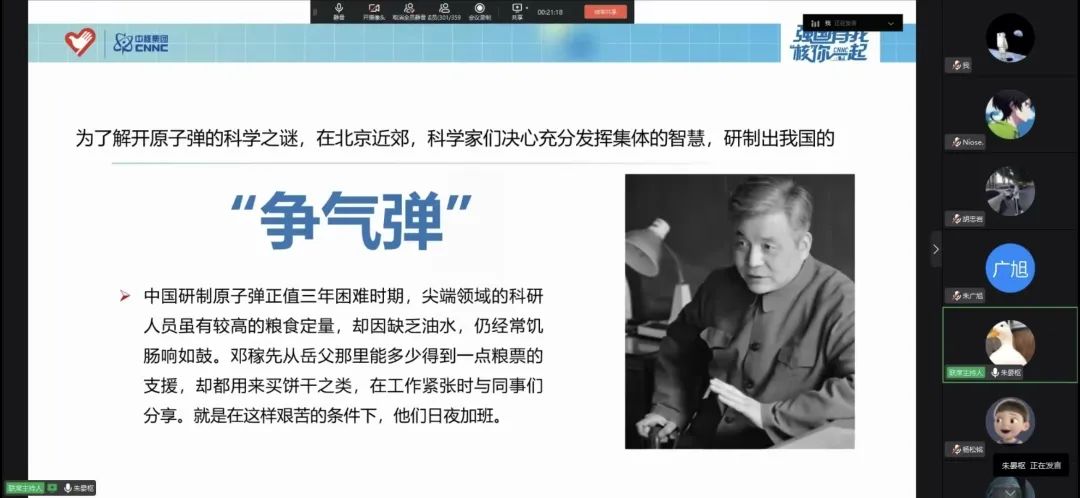 2022年6月7日晚19:00,jinnian金年会智能制造技术学院召开了“强国有我,核你一起”中国核工业脊梁主题宣讲活动,本次会议由李晴同学主持,机械高本21-02班的朱晏枢同学进行宣讲,会议围绕“两弹元勋”邓稼先的人物简介和生平事迹进行展开。邓稼先院士远赴重洋,出国深造。他的优秀成绩和吃苦精神让他的导师德尔哈尔教授对他十分欣赏,有意带他去英国继续深入研究。那里平台更大,前景会更广阔,但他没有片刻犹豫,婉拒了导师的好意。已让决然的选择回到国家,在北京外事部门的招待会上,有人问他带了什么回来。他说:“带了几双眼下中国还不能生产的尼龙袜子送给父亲,还带了一脑袋关于原子核的知识。”此次会议立志于培养同学们对核武器的认识已及核工业精神对国家的影响进行宣扬,相信通过本次会议会对同学们对核的看法有了更深层次的了解,以及核工业精神对国家的影响,也希望同学们能够通过本次会议在未来的学习中能够实现现代化强国而努力学习。邓稼先院士对祖国的贡献和伟大的爱国精神,也值得我们每个人去学习。