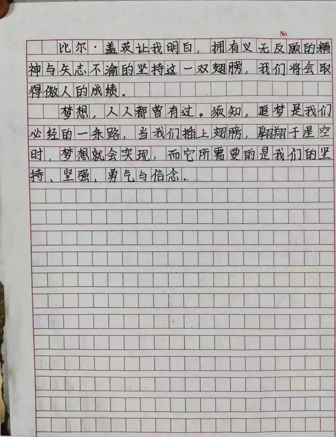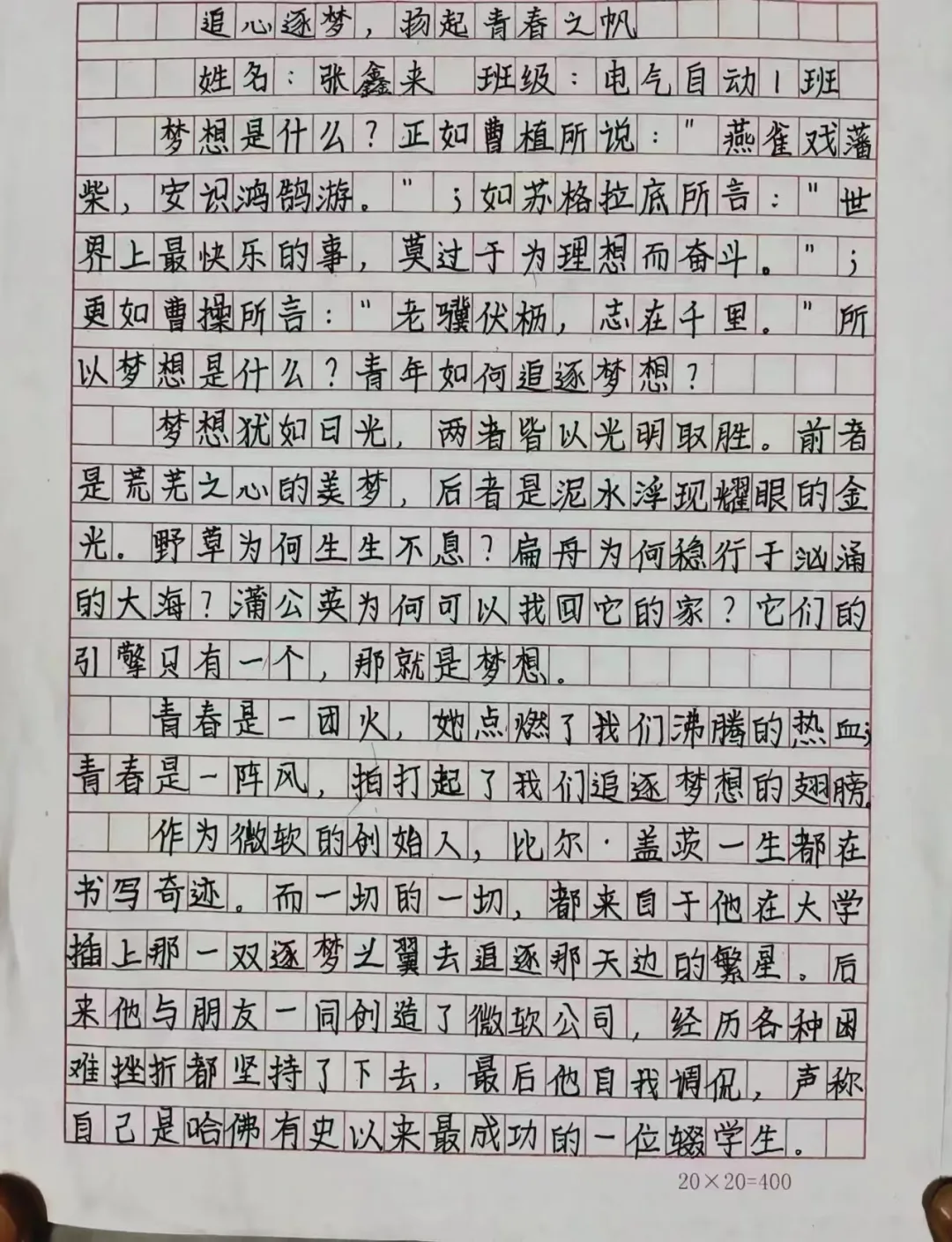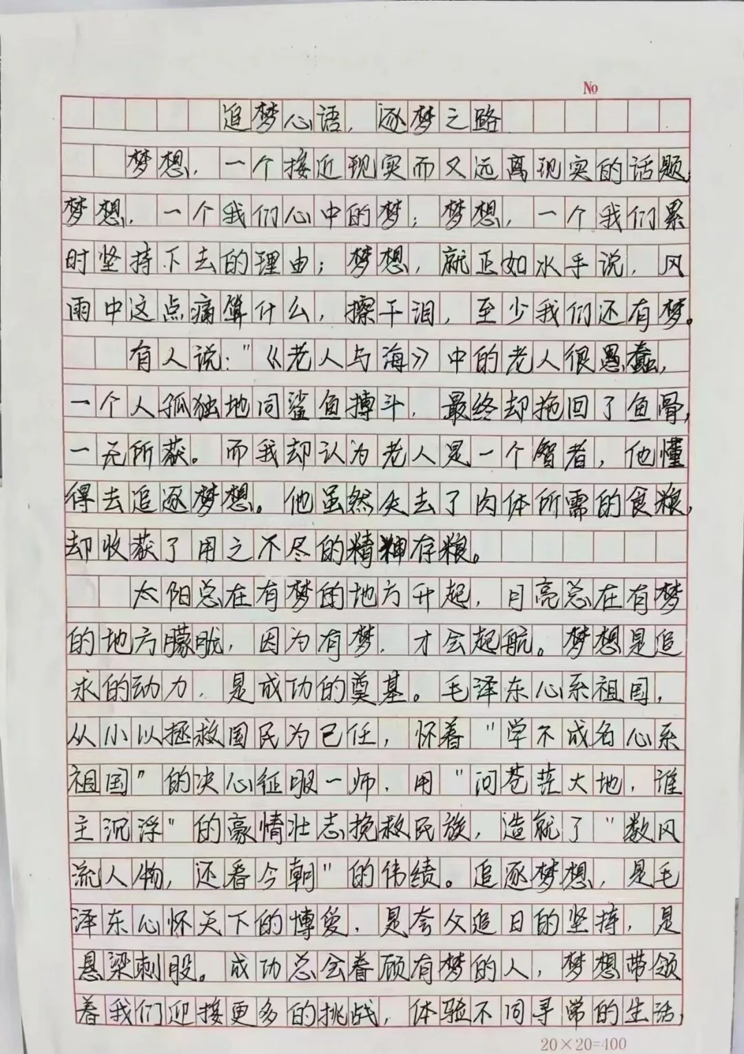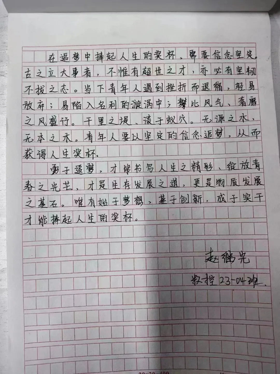 在这个充满机遇和挑战的时代,梦想是我们前进的动力。本次活动以梦想为主题,要求同学们手写创作原创文章。希望通过这种方式,让大家更深入地思考自己的梦想,以及如何在逐梦路上前行。通过书写自己的追梦心语,同学们可以更加清晰地认识到自己的目标和追求,找到为之努力奋斗的方向。