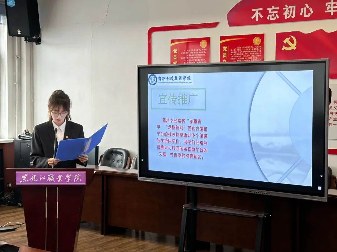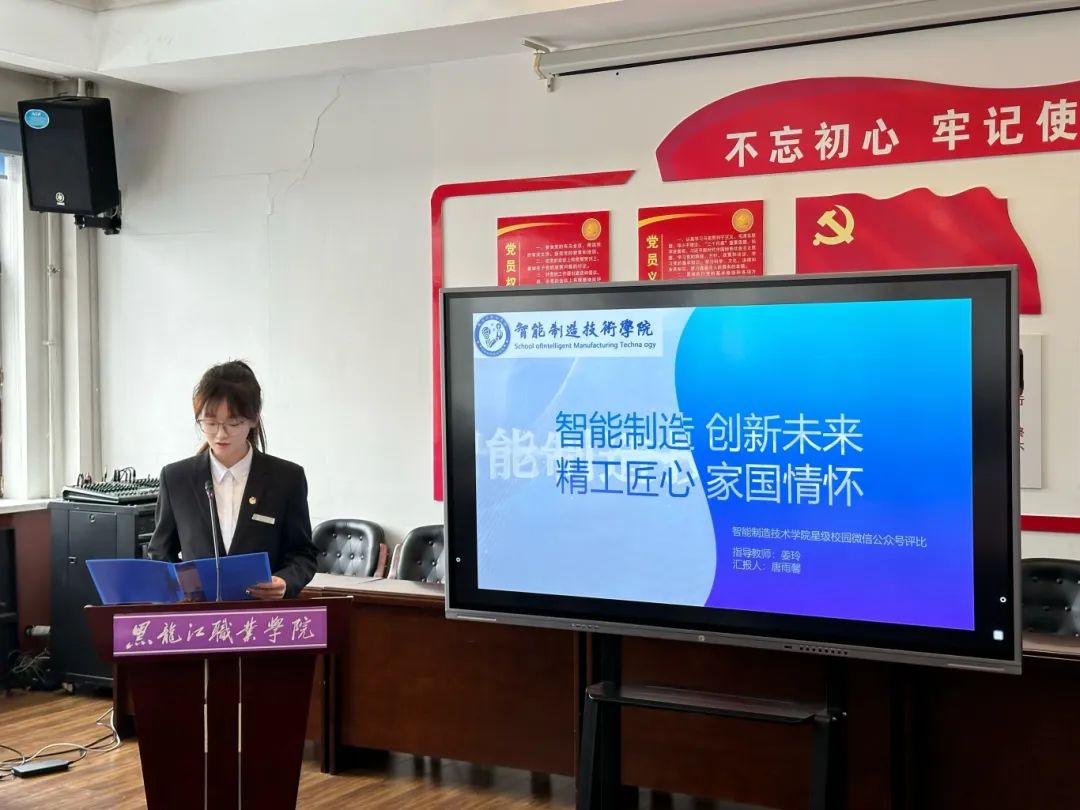 为进一步强化校园网络文化建设,稳固网络主阵地、传递网络正能量,促进学校微信公众号蓬勃发展,营造弘扬主旋律、传播正能量、汇聚好声音的网络舆论环境,2025年4月18日9:00,在智能制造技术学院团总支书记姜玲老师的引领下,团队参与了由校团委组织开展的2024 - 2025学年“星级校园微信公众号”述职评比会。团总支学生副书记唐雨馨对此次述职会进行工作汇报。