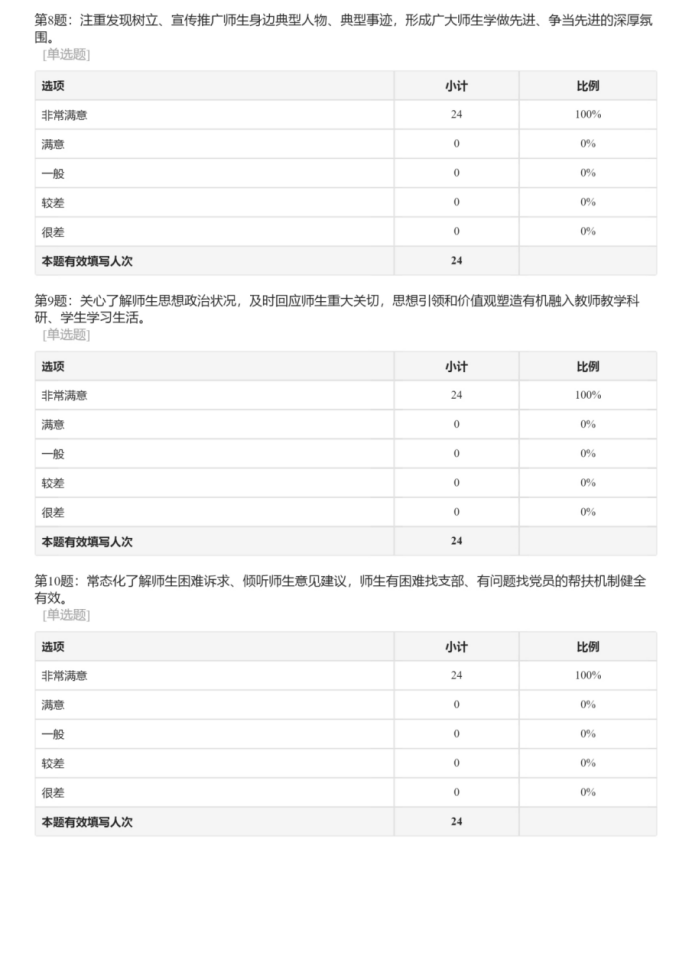 测评问卷紧扣教育部“七个有力”高校党建标准,围绕教育党员有力、管理党员有力、监督党员有力、组织师生有力、宣传师生有力、凝聚师生有力、服务师生有力等核心维度设计问题。结果显示,支部在理论学习深度融合专业特色、党员先锋岗示范引领、师生急难愁盼问题攻坚等方面表现尤为突出。