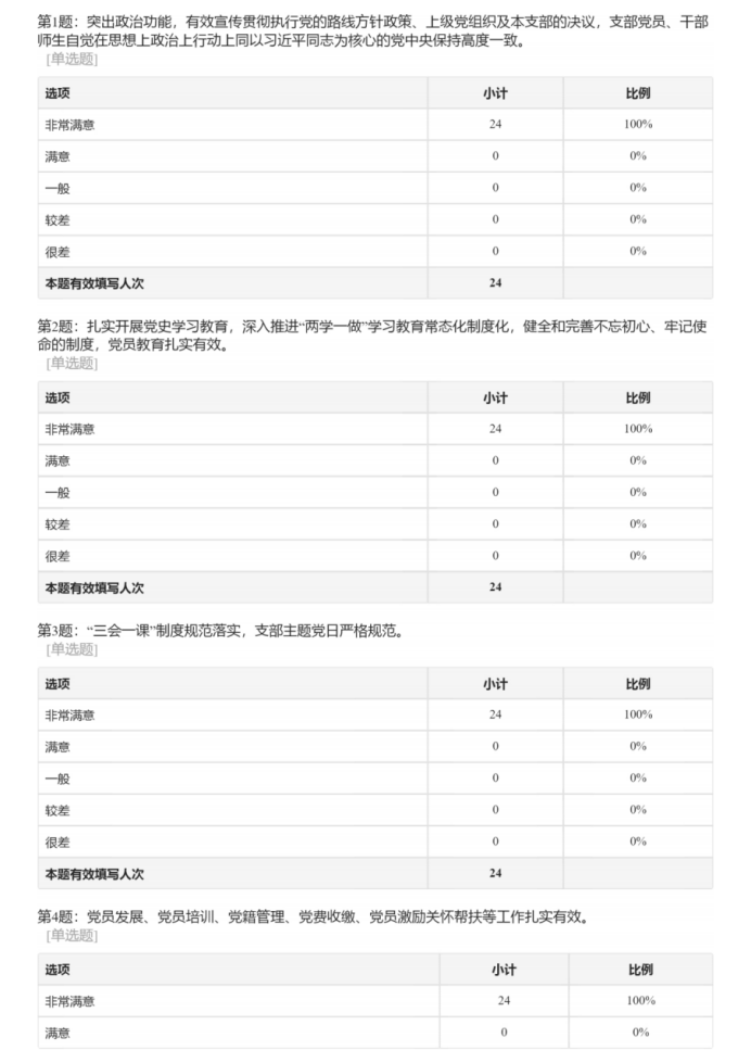 本次测评严格遵循上级党组织要求,采用“不记名填写、集中填答、当场回收”的全流程闭环管理,确保评价客观公正。支部书记李明阳表示:“测评既是对样板支部建设成效的‘全面体检’,更是对党员主体作用的充分尊重。”24份测评表回收率100%,五级评价标准中“非常满意”选项全票当选,折射出党员对支部工作的高度认同。