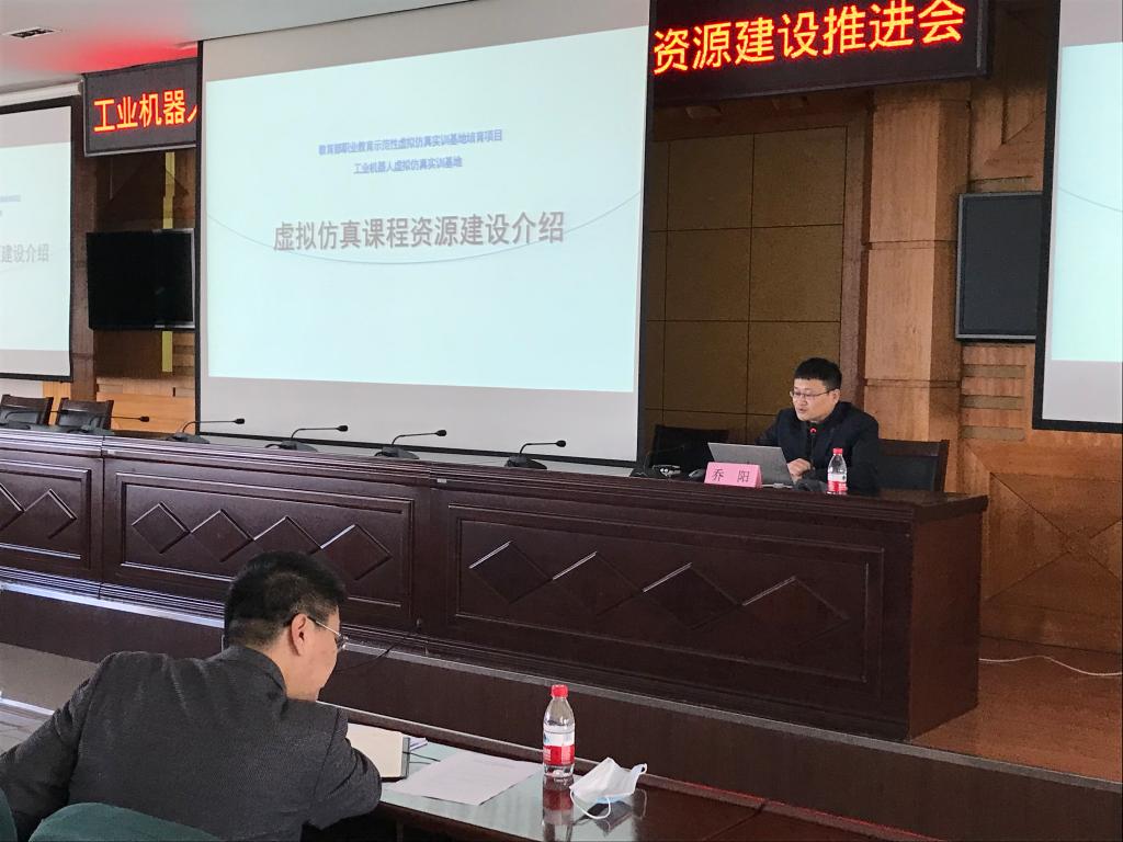 其次,电气工程学院工业机器人技术教研室乔阳老师进行虚拟仿真课程资源建设介绍,乔老师从虚拟仿真课程资源建设概述、虚拟仿真课程资源案例介绍、虚拟仿真课程资源建设流程三个方面为大家讲解课程资源建设的目的以及规划,说明了痛难点以及课程建设要求、虚拟仿真实训设施设备类型及使用方法等;乔阳老师、杨宏帅老师以《工业机器人典型应用现场编程与调试》和《工业机器人工业机器人应用工艺案例》2门课程虚拟仿真资源建设为案例,从虚拟仿真课程资源建设方案规划和虚拟仿真课程资源建设脚本撰写两个方面进行的具体展示和举例;敖冰峰院长就国家职业教育示范性虚拟仿真实训基地培育项目——jinnian金年会工业机器人虚拟仿真实训基地的项目整体情况进行汇报讲解。