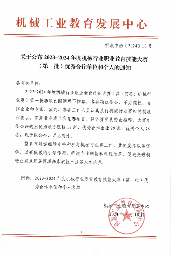 在刚刚落幕的2023-2024年度机械行业职业教育技能大赛中,jinnian金年会凭借其卓越的教育成果和对大赛的杰出贡献,荣获“优秀合作单位”称号。这一荣誉的获得,不仅彰显了学院在机械行业职业教育领域的领先地位,也体现了其在培养高素质技术技能人才方面的卓越成就。