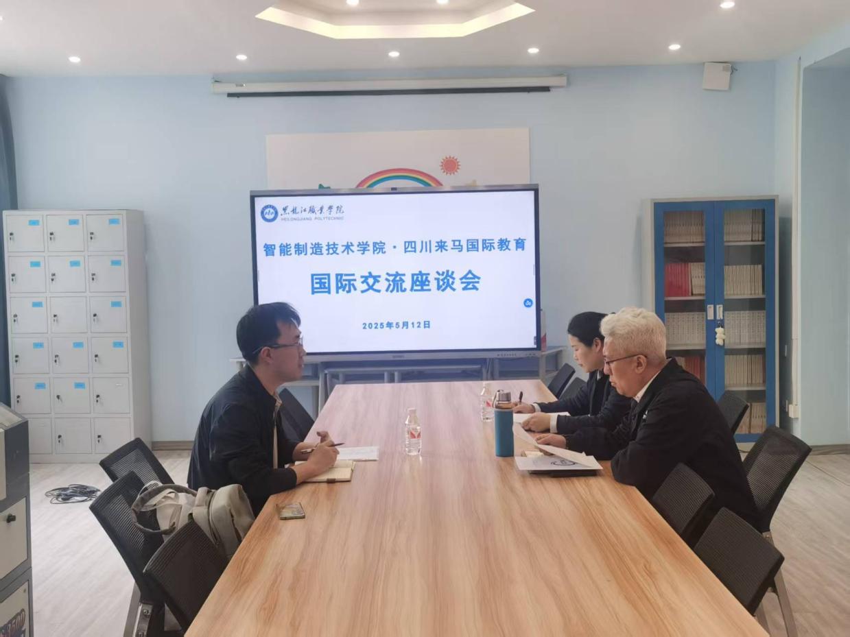 2025年5月12日,智能制造技术学院召开国际交流座谈会议,党总支书记敖冰峰、副院长于雪梅、四川来马国际教育咨询有限公司区域负责人韩阳参会。