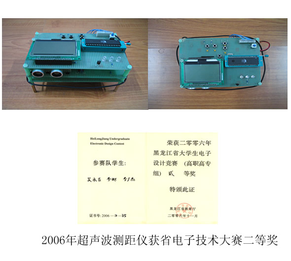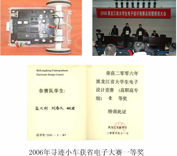 获奖情况:1、孟凡利、刘春杰、姚君同学荣获二零零六年黑龙江省大学生电子设竞赛(高职高专组)壹等奖;