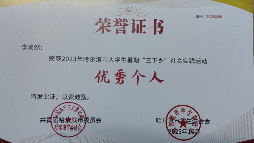为贯彻落实习近平总书记关于青年工作的重要思想,团市委坚持“受教育、长才干、作贡献”的宗旨,进一步激发广大返乡大学生热爱家乡、建设家乡的热情,全面总结2023年暑期实践成果,10月20日,团市委、市学联在哈尔滨青年宫开展了2023年哈尔滨市大学生暑期"三下乡"社会实践活动示范团队评选暨总结交流。本次活动共有来自13所高校的16支团队入围示范团队评选,各团队代表依次进行成果展示。为贯彻落实习近平总书记关于青年工作的重要思想,团市委坚持“受教育、长才干、作贡献”的宗旨,进一步激发广大返乡大学生热爱家乡、建设家乡的热情,全面总结2023年暑期实践成果,10月20日,团市委、市学联在哈尔滨青年宫开展了2023年哈尔滨市大学生暑期"三下乡"社会实践活动示范团队评选暨总结交流。本次活动共有来自13所高校的16支团队入围示范团队评选,各团队代表依次进行成果展示。我院团总支荣获2023年哈尔滨市大学生暑期"三下乡"社会实践活动优秀单位。此外,荣获2023年哈尔滨市大学生暑期"三下乡"社会实践活动优秀团队6个,荣获2023年哈尔滨市大学生暑期"三下乡"社会实践活动优秀个人6个,其中我院"探寻红色文化,赓续红色记忆"实践项目荣获2023年哈尔滨市大学生暑期"三下乡"社会实践活动优秀品牌项目荣誉称号。“行胜于言,实践出真知”,未来,我院也将进一步完善教育工作,引导青年学子更加积极参与到各类社会实践活动中,在社会课堂中“受教育、长才干、作贡献”,为全面建设社会主义现代化国家贡献青春力量!