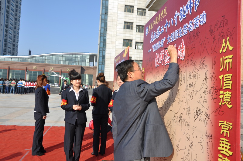 在签名活动现场,学院党委书记冯玉龙,院长赵继会,副院长刘公远、李贵林,党委副书记张玉山,纪委书记周莲香,副院长王明海等学院领导与老师们一起在“教师签名墙”上签上自己的名字,以表达对全院所有教师的节日祝贺!同学们更是争先恐后地在“学生签名墙”上郑重地签上自己的名字,为教师送上节日的祝福,载满了同学们对教师真挚的情感,传达出我院莘莘学子的心声。