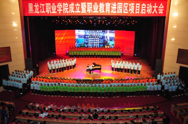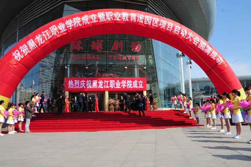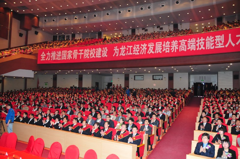 2012年5月16日,哈尔滨会展中心环球剧场装饰一新,门前,两百面校旗、40个悬挂标语的空飘彩球迎风招展,前厅,各级领导、兄弟院校来宾、中外企业代表,中央及省、哈尔滨市各新闻单位记者,以及教师和学生们踏着红地毯,在迎面竖起的巨大签名墙上签名留念。十八块由二级学院、百名教授、百名校友、百家企业的标识构成的宣传展板矗立在红毯两侧,展示学院办学的实力和成就。会前,千余师生观看了学院宣传片,进行了校歌拉唱,喜迎新“龙职”的诞生。