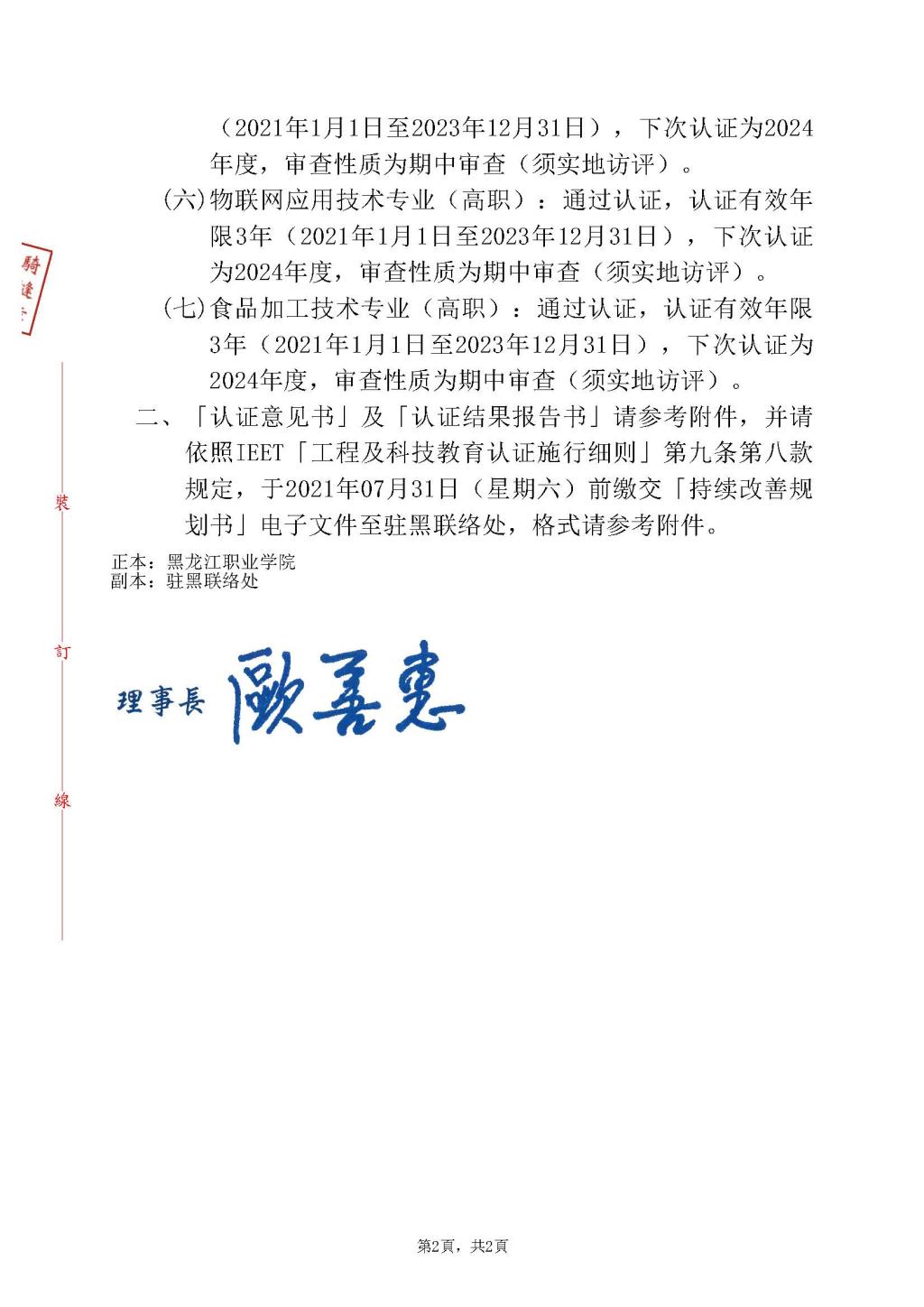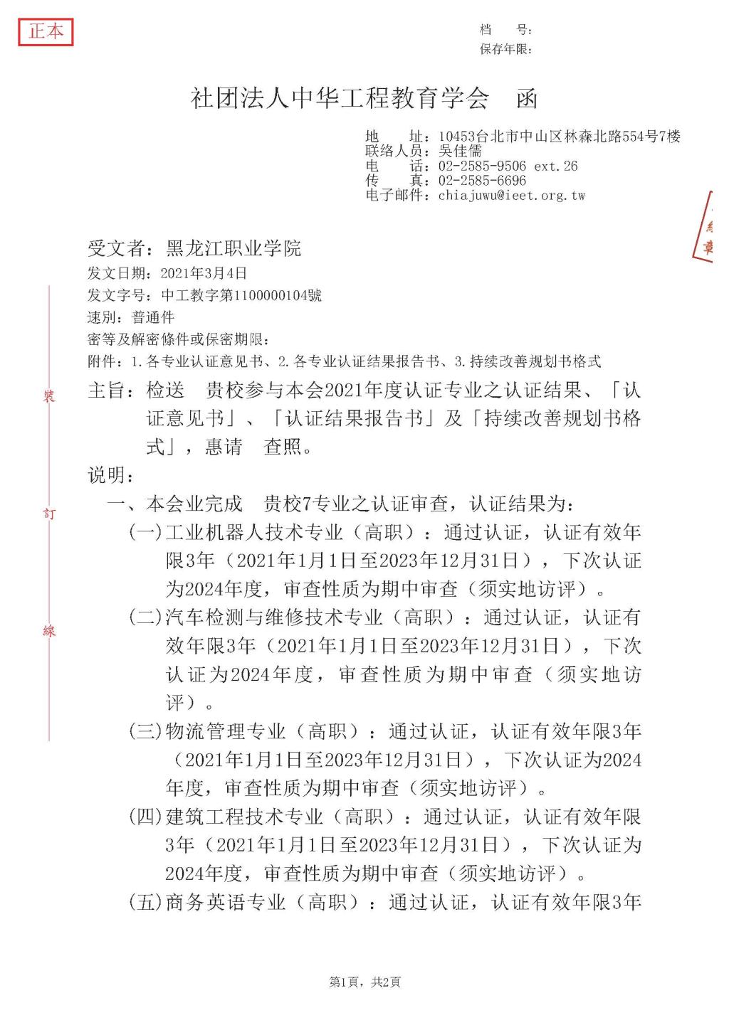 新学期开学传来好消息,根据中华工程教育学会(IEET)认证委员会2021年3月4日公布,金年会2021年接受认证的工业机器人技术、汽车检测与维修技术、物流管理、建筑工程技术、商务英语专业、物联网应用技术、食品加工技术专业等7个专业全部顺利通过认证。至此,加上之前通过认证的数控技术、计算机网络技术、电气自动化技术、建筑装饰工程技术和药品生产技术等5个专业,金年会已经有12个专业通过IEET工程教育认证,是黑龙江省通过国际工程教育认证专业数量最多的高职院校。