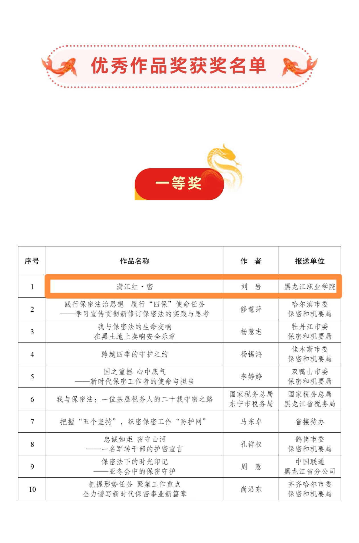 下一步,学校将以此次获奖为新的起点,秉持高标准的工作作风,继续深化保密法治教育,不断创新保密宣传教育形式与载体,切实增强师生保密意识与责任担当,引导“龙职”师生自觉成为“保密法治的自觉践行者、国家秘密的忠实守护者、国家安全的坚定捍卫者”。