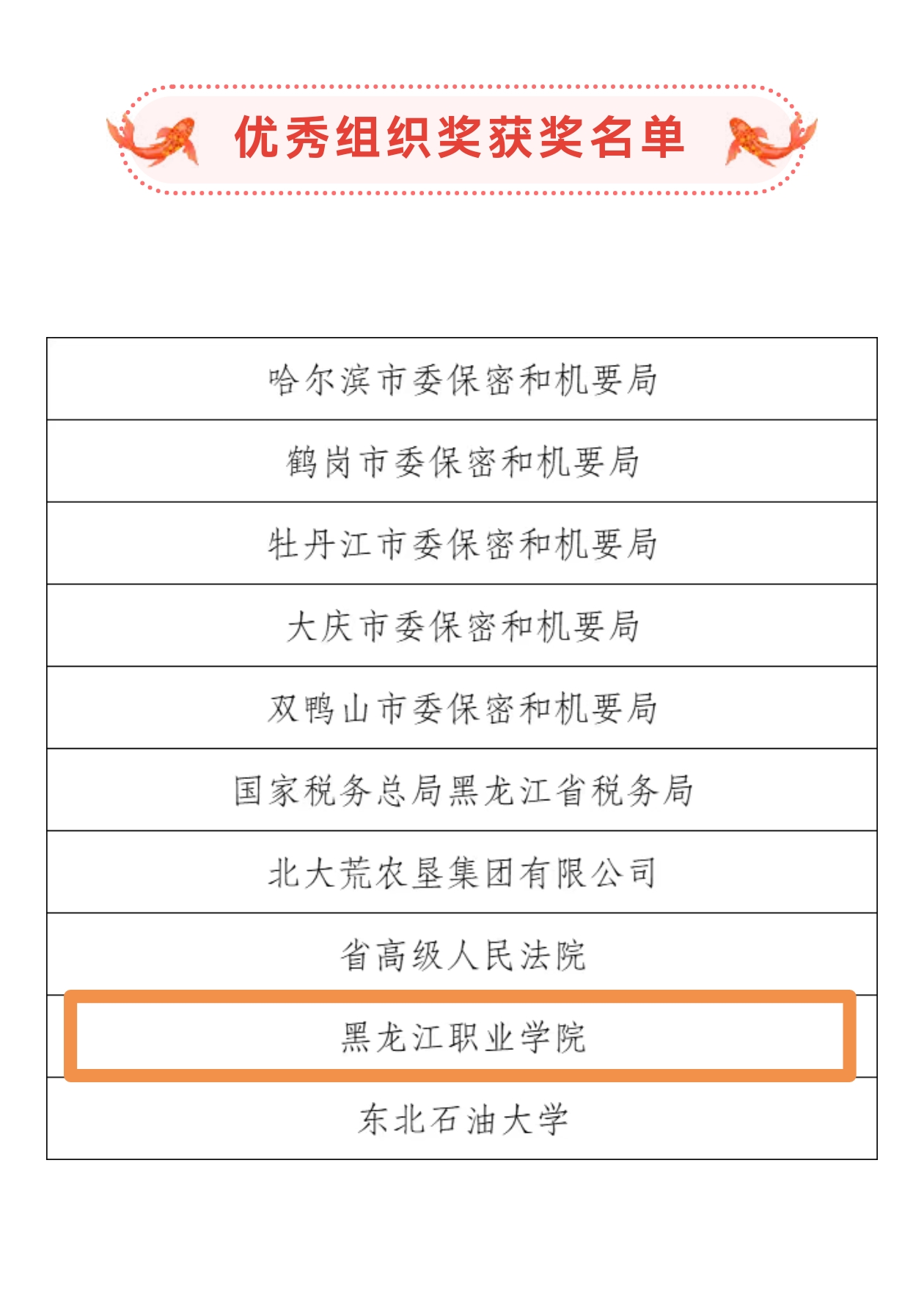 近日,中共黑龙江省委保密委员会办公室、黑龙江省国家保密局公布了“我与保密法”保密主题征文活动获奖名单。学校凭借扎实的组织工作和高质量的征文作品,荣获“优秀组织奖”称号,成为全省十家获此殊荣的单位之一,更是唯一获此奖项的高职院校。这一荣誉不仅是对学校保密宣传教育工作的高度肯定,更是学校长期以来重视保密工作、积极推动保密文化建设的有力见证。