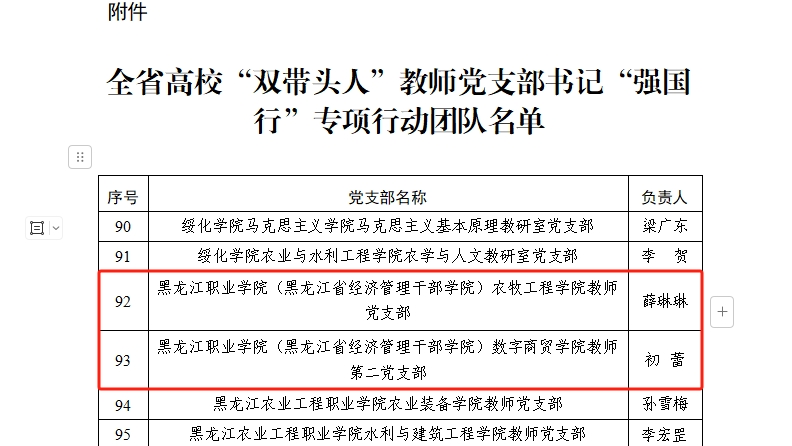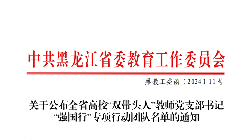 近日,黑龙江省委教育工委公布了全省高校“双带头人”教师党支部书记“强国行”专项行动团队名单,金年会农牧工程学院教师党支部、数字商贸学院教师第二党支部成功入选全省高校“双带头人”教师党支部书记“强国行”专项行动团队。