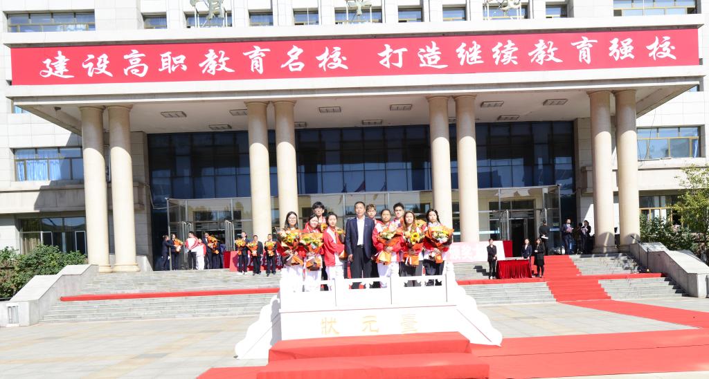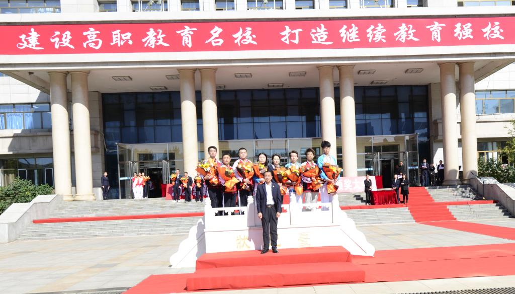 音乐响起,获奖者依次走上红毯,登上状元台,党委书记崔治春、校长王利文、党委副书记周家郁、纪委书记李伟、组织部部长钟敏强为7名金奖、7名银奖、17名铜奖获奖代表颁奖,并合影留念。
