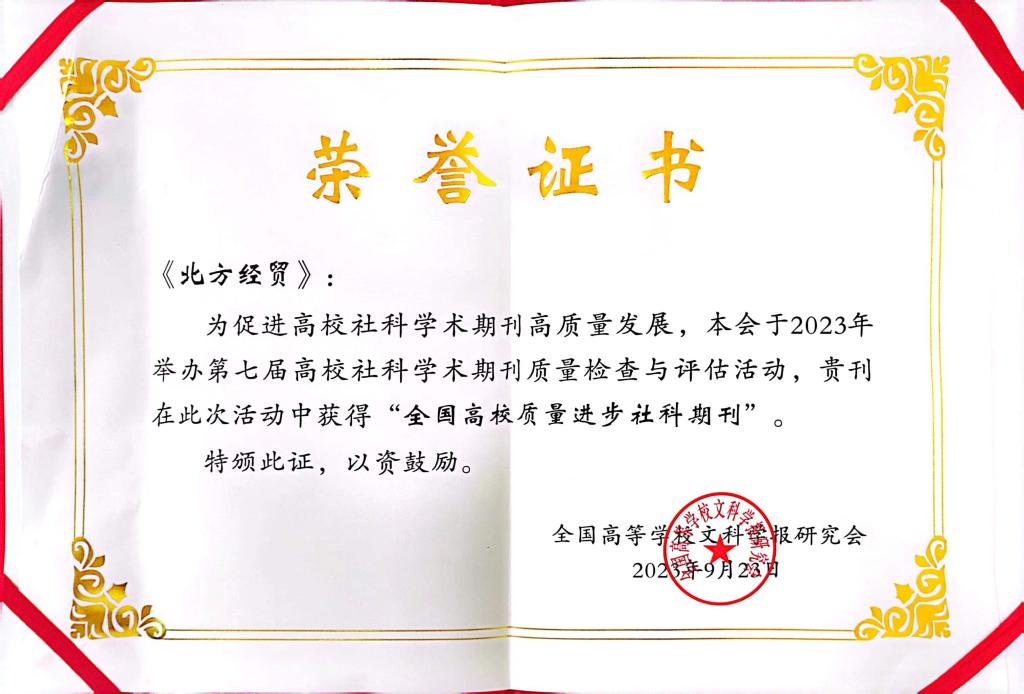 全国高等学校文科学报研究会是教育部主管的学术性、全国性、非营利性的社会组织,国家一级学会,是我国高等学校学术期刊界最为重要的组织机构之一。研究会每四年组织一次全国性的高校社科学术期刊评优活动,综合考量期刊的政治标准、学术水平、社会影响、编辑质量、出版质量等五项指标,全国参评社科期刊一千多家。《北方经贸》获评“全国高校质量进步社科期刊”是学术界、期刊界对金年会办刊质量的充分肯定,也是当前学校高质量建设的又一项重要成果,对进一步打造学术期刊精品、推进学术创新、扩大学术影响力具有重要意义。《北方经贸》全体编辑将以此为契机,以更高的标准和更好的质量,继续为学校学科建设、地方发展和学术界繁荣作出贡献。
