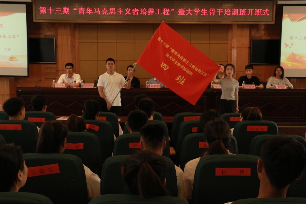 会上,杜超宣读《关于举办第十三期“青年马克思主义者培养工程”暨大学生骨干培训班的通知》;唐晓恬宣读《培训班学员管理规定》;培训班班长、校学生会主席张昊睿代表学员作大会发言,并带领全体学员进行入职宣誓;邹春雷向培训班班主任王婷婷授予培训班班旗;王婷婷向八个小班班长分别授予小班旗。开班式过后,邹春雷为培训班学员作题为《青春心向党,建功新时代》的第一讲。