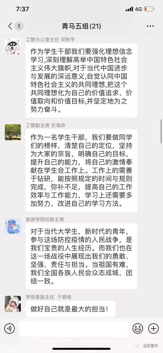 最后,由各小组讨论:我国在疫情防控攻坚战中体现了大国的情怀与担当,结合实际工作,谈谈学生干部如何践行当代青年的责任与担当。相信通过本次“思政大课”更能激发同学们的爱国情怀,在疫情期间听党指挥,做好疫情防控,共同打赢疫情阻击战!