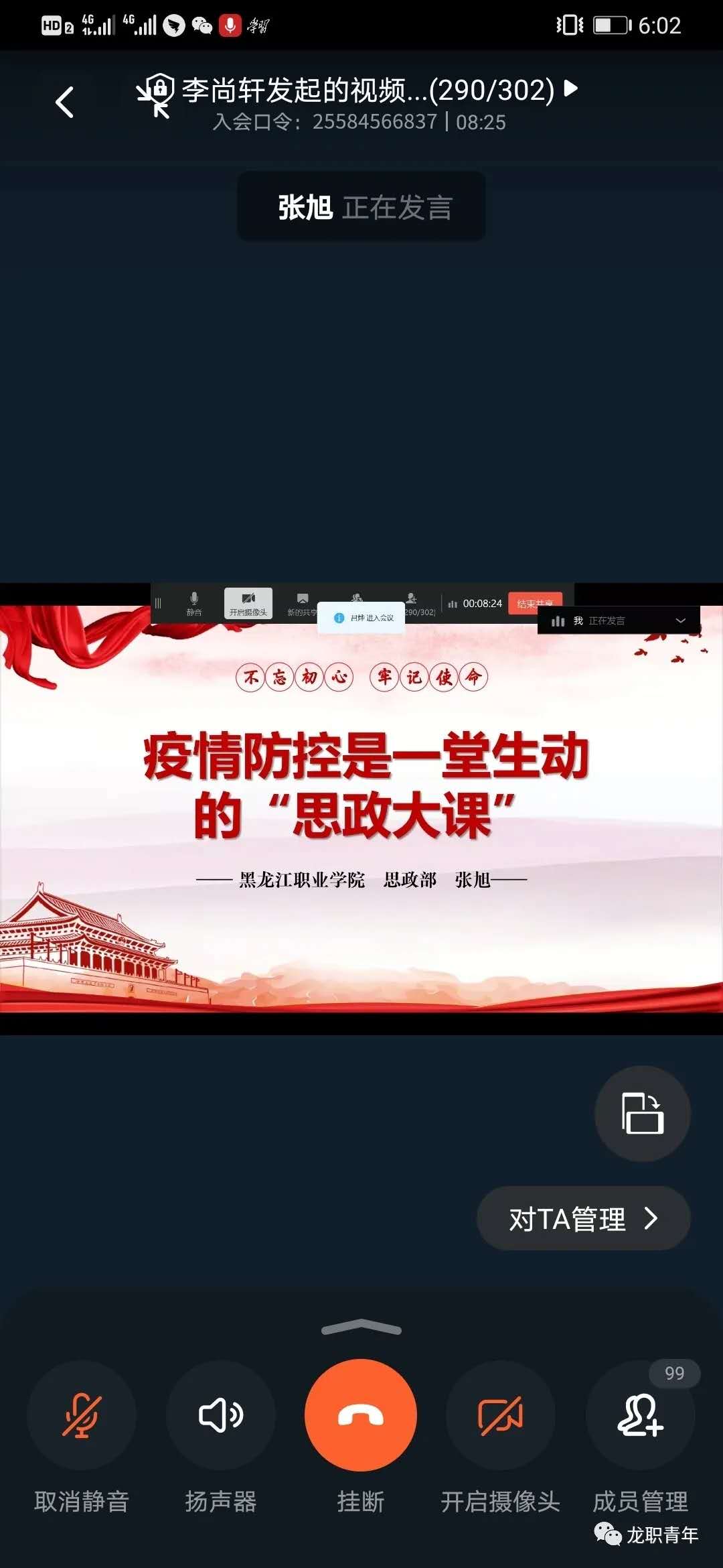 6月14日下午18:00时,第十四期“青年马克思主义者培养工程”暨大学生骨干培训班第二讲在“钉钉”平台上如期进行。本次讲座特邀金年会思政部德育教研室张旭老师为同学们作了题为《疫情防控是一堂生动的“思政大课”》的专题讲座,校团委书记邹春雷、副书记杜超、组宣办主任唐晓恬出席本次会议,来自校学生会、校社团联合会、校新媒中心、校纪管委、校军操委、校公寓委、校关心委、校综合委、校学信委、校伙食委以及各二级学院学生会共298名2019级主要团学干部学员参加了讲座。由团委学生副书记刘丽利主持