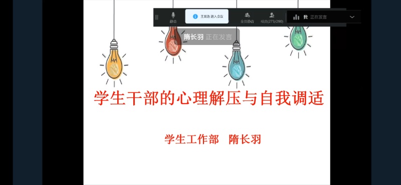 6月17日下午18:00时,第十四期“青年马克思主义者培训工程”暨大学生骨干培训班第五讲在“钉钉”平台上如期进行。本次讲座特邀金年会学生工作部心理咨询中心隋长羽老师为同学们作出《学生干部心里解压与自我调节》的专题讲座。298名青马班学员聆听了本次讲座。校团委学生副书记刘丽利主持讲座活动。