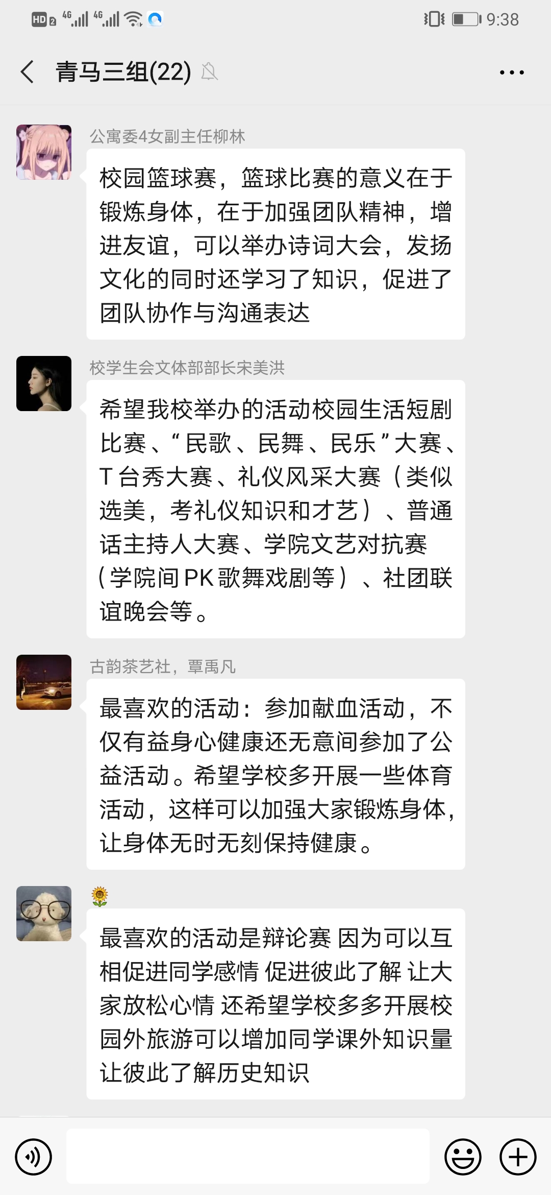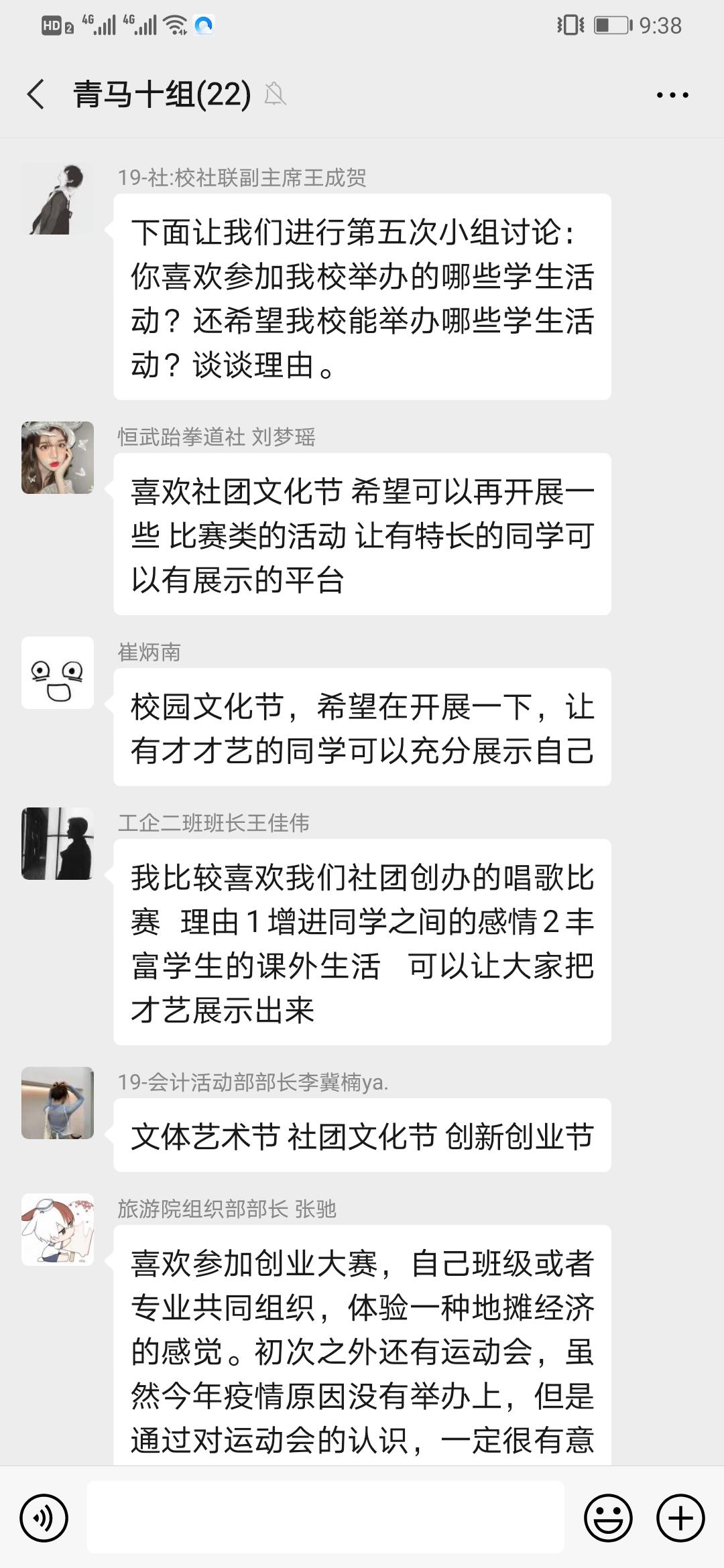 在小组讨论环节,同学们就“你喜欢参加金年会举办的哪些学生活动?还希望金年会能举办哪些学生活动?”展开了充分的讨论,同学们纷纷发言,并解释,学生活动可以锻炼自己、展现自己,也可以建立与人沟通的能力和交往能力,还可以锻炼大家的团队协助能力。