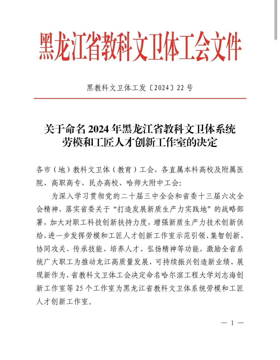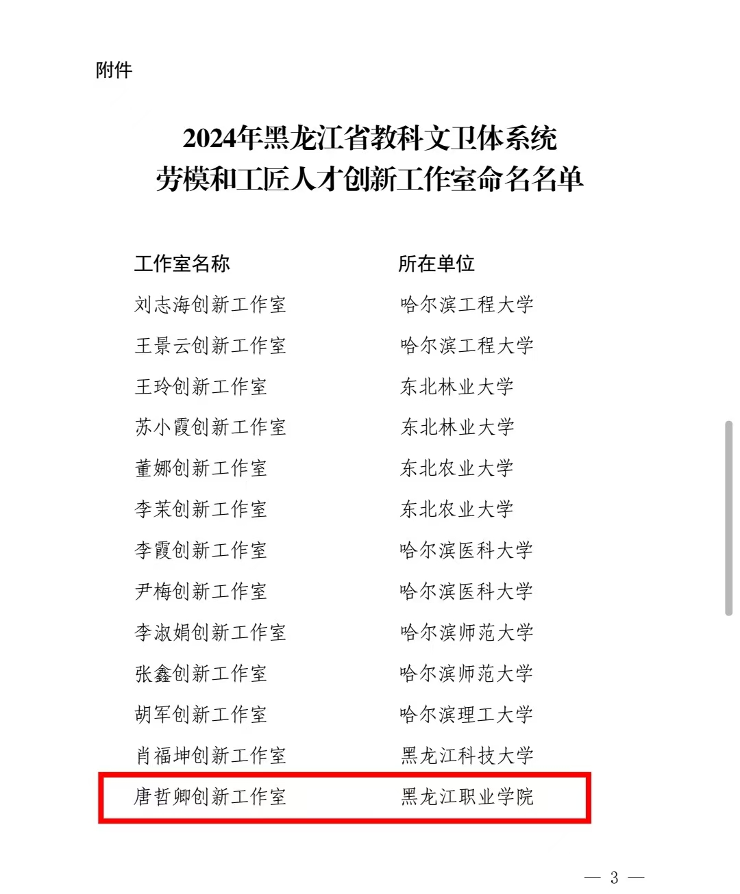 近日,省教科文卫体工会下发《关于命名2024年黑龙江省教科文卫体系统劳模和工匠人才创新工作室的决定》,全省共25个工作室获评省教科文卫体系统劳模和工匠人才创新工作室,金年会唐哲卿创新工作室、杨宏帅创新工作室获此殊荣。