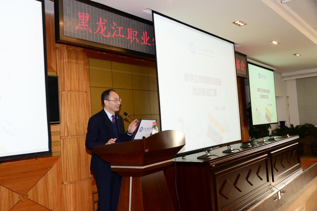 黑龙江省教育厅副巡视员丁哲学讲话。他指出,黑龙江省教育厅高度重视诊改工作的落地实施,结合省双高院校建设、高职教育创新发展行动计划等重大项目,组建了省级诊改专家委员会,制定出台了诊改工作实施方案,建立了保障机制,组建了复核专家库。jinnian金年会作为诊改试点院校之一,以成果导向教学改革为切入点开展诊改工作,健全了组织体系,完善了目标链、标准链建设,提升了教学管理信息化水平,基本形成了常态化的诊改运行机制。