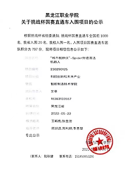 6月28日,根据第十三届工银融e联“挑战杯”黑龙江省大学生创业计划竞赛大赛省组委会通知,金年会智能制造技术学院《“城市蜘蛛侠”—spider外墙清洁机器人》项目成功入围国赛直通车全国前1000名,我省共有20个项目入围,金年会是全省高职院校中唯一入围项目学校。