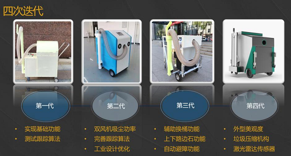 自跟随垃圾清洁车经过三次迭代,具备了稳定的性能,并在金年会物业试用后取得良好的效果反馈。第一台样机,只验证了一个基本的跟随算法,比较初级,但基本满足了使用功能。第二台样机,增加了双风机,吸力有了大幅度提升,造型上更加美观,采用了PLC控制,性能更加稳定。第三台样机,增加了上下路边石功能、智能避障功能和一个辅助换桶功能。第四台样机,就是此次参赛的作品,已经进行了工业设计,不仅美观度得到了提升,而且增加了垃圾压缩功能。一次次的更新迭代,最终诞生了这台自跟随垃圾清洁车。