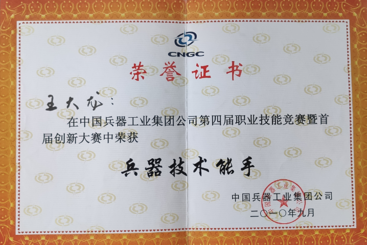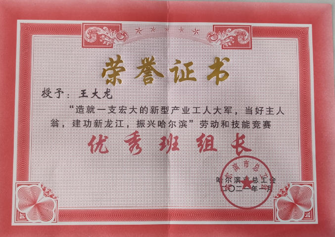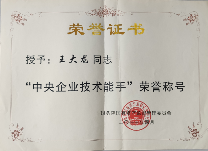 不忘初心、磨砺技艺。从学校毕业分配到公司,王大龙开启了在企业的成长之路,他秉承着在校期间养成的良好习惯和职业素养,始终坚持刻苦学习、勤于练习、甘于奉献、忠于职责,脚踏实地的干好每一项工作。入职不久他就凭着不怕吃苦、踏实肯学的工作态度被选为公司出口国外的硝酸储罐生产项目焊工班成员之一。跟着师傅他虚心请教学习、休息时间潜心钻研,在项目的完成过程中他的技能水平得到了大幅度的提升。此后,在国家重视技能人才,公司崇尚技能的支持下,他利用各种闲暇时间提升技能水平,丰富理论知识,不断地磨砺技艺。2010年在哈尔滨建成集团举办的技能竞赛中脱颖而出,取得焊接组第一名,获得代表公司参加中国兵器集团技能大赛的资格,并最终荣获“兵器技术能手”称号;2011年被国务院国有资产监督管理委员会授予“中央企业技术能手”荣誉称号,此后,多次参加公司、行业举办的技能竞赛并取得了优异的成绩;曾荣获嘉克杯国际焊接技能大赛“优秀选手”,“哈南十大工匠”等荣誉称号,多次被公司评为“劳动模范”。