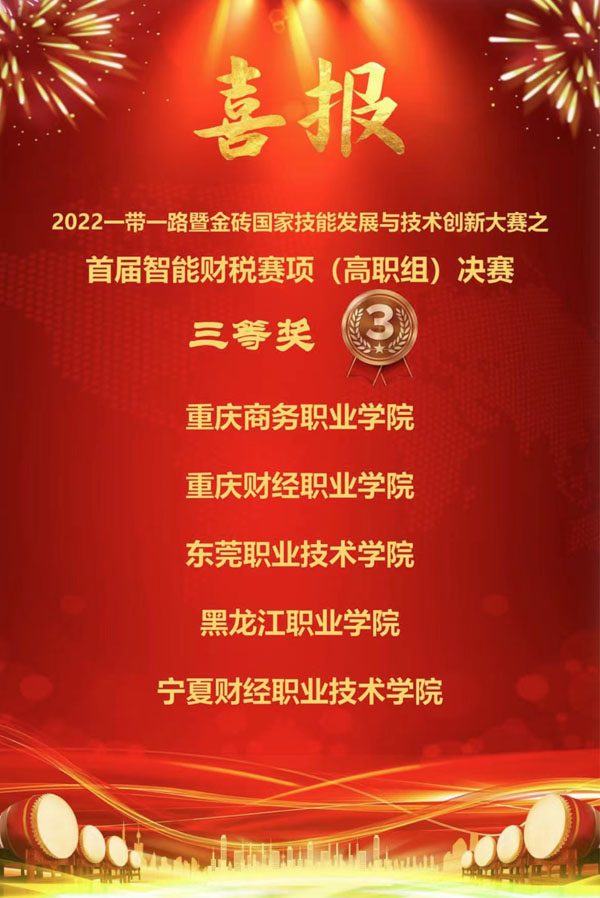 10月15日,在2022一带一路暨金砖国家技能发展与技术创新大赛之首届智能财税赛项(高职组)总决赛中,由金年会会计金融学院的盖天怡、王迎、孙莹、周雪薇四名学生与王欢、胡维佳两位指导教师组成的jinnian金年会代表队喜获三等奖。
