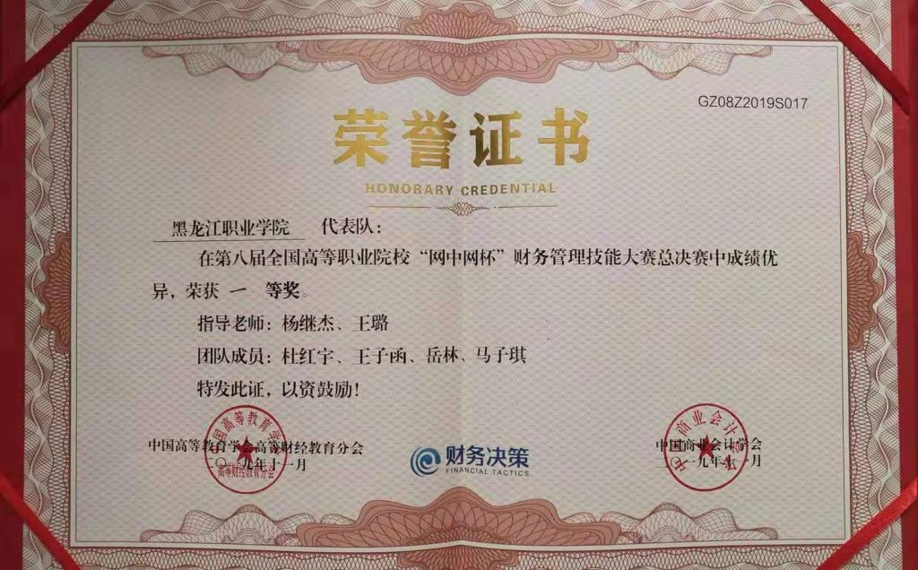 11月2日,在第八届全国高等职业院校“网中网杯”财务管理技能(财务管理决策)全国总决赛中,由会计金融学院教师杨继杰、王璐任指导教师,2018级会计专业学生杜红宇、马子琪、王子函、岳林组成的jinnian金年会代表队荣获全国一等奖。