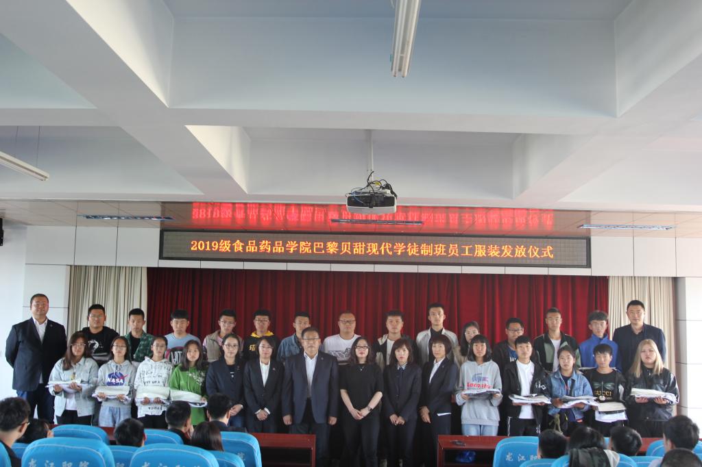 开班式上,胡娜为2019级全体同学发放了新工服,新生代表上台发言,表达了成为现代学徒制班学生和巴黎贝甜员工的喜悦心情,并表示一定会珍惜学校和企业为他们提供的平台,刻苦学习技能,磨炼意志,成为一名可以回报社会的有用之人。胡娜为2019级巴黎贝甜班学生(学徒)上了精彩的第一课,也标志着食品药品学院2019级巴黎贝甜现代学徒制班正式开班。胡娜毫无保留地跟同学分享她在巴黎贝甜服务10年来的经验,并介绍了公司未来五年的发展规划、巴黎贝甜员工待遇及职涯发展路径等,鼓励同学们努力向前就会有收获,公司会始终关注每个同学的成长。这精彩的一课让学生们深刻感受到了企业的关怀,更坚信了自己的选择。