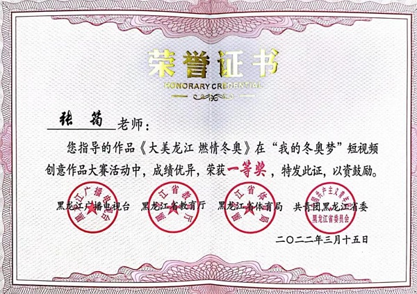 2月4日,北京冬奥会举办前夕,黑龙江广播电视台联合黑龙江省教育厅、黑龙江省体育局、共青团黑龙江省委员会共同发起了“我的冬奥梦”短视频创意作品大赛,金年会通识教育学院公共外语教研室主任张筠指导的作品《大美龙江 燃情冬奥》在全省3363件作品中脱颖而出,荣获黑龙江省高职院校组一等奖。