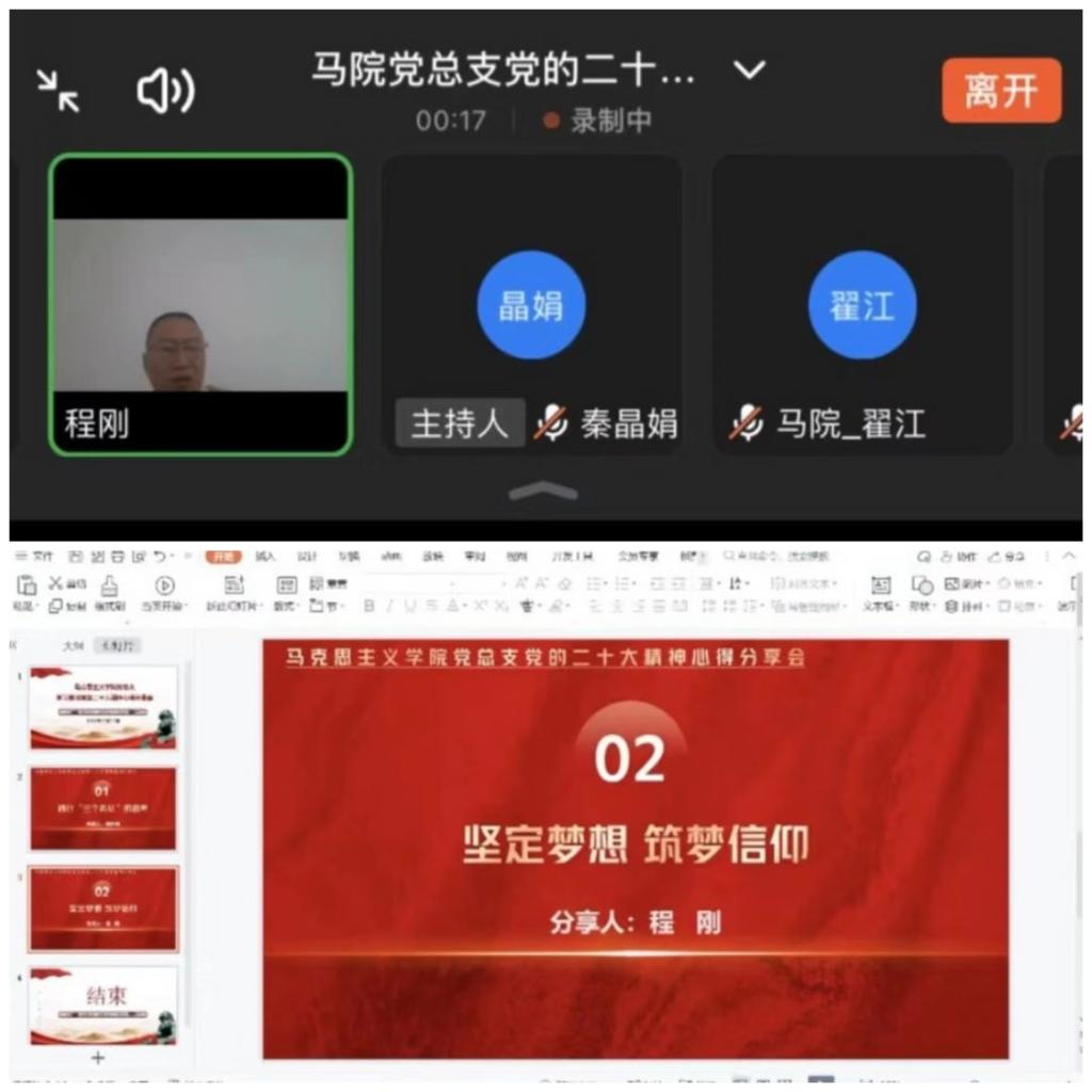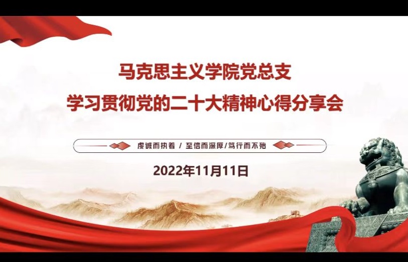 中国共产党第二十次全国代表大会是一次高举旗帜、凝聚力量、团结奋进的大会。学习宣传贯彻党的二十大精神是当前和今后一个时期全党全国的首要政治任务,马克思主义学院党总支认真贯彻落实学校关于学习贯彻党的二十大精神相关工作要求,11月11日下午在线上召开学习贯彻党的二十大精神分享会。会议由马克思主义学院党总支书记程刚主持,马克思主义学院全体教师参会。