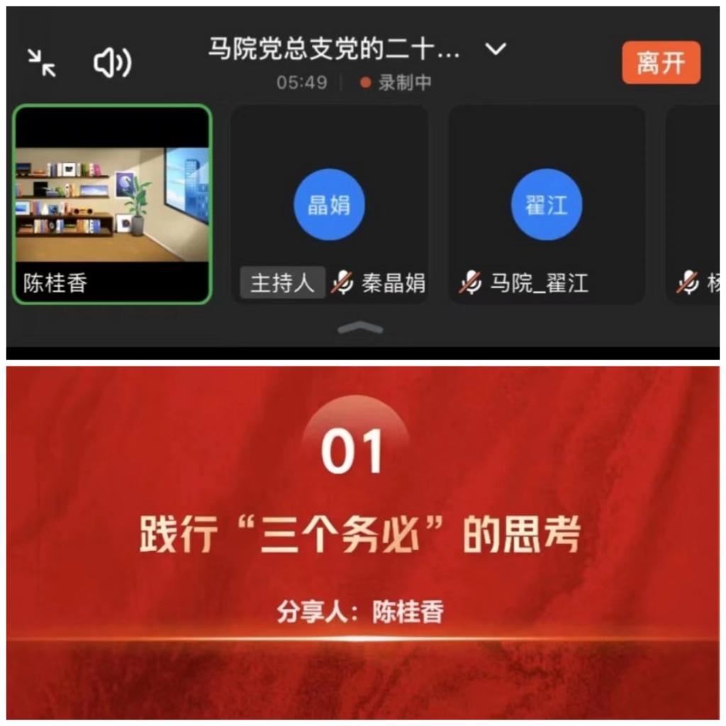 会议第二项,陈桂香以《践行“三个务必”的思考》为题进行分享。首先,她谈到从“两个务必”到“三个务必”是党跨越70多年时空的对话,变的是数字,不变的是中国共产党优良的作风以及一脉相承的自觉和清醒。随后,她谈到“三个务必”提出的深刻内涵、提出的意义及践行的要求。最后,她给出马克思主义学院教师学深悟透党的二十大精神的建议,倡议要对照着学、生动地学、系统地学,并推动党的二十大精神进教材、进课堂、进头脑。