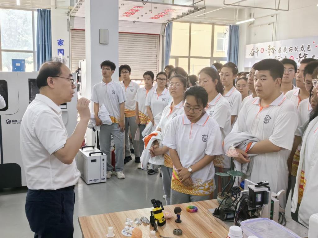 为贯彻落实习近平总书记对学校思政课建设作出的重要指示精神,深入推进大中小学思想政治教育一体化建设,7月4日,jinnian金年会与哈尔滨师范大学附属中学联手举办思想政治教育一体化研学活动。金年会马克思主义学院党总支书记程刚、副书记车延平,智能制造技术学院党总支书记敖冰峰、副院长李子峰、副书记李焕然、副院长鲍敏与哈尔滨师范大学附属中学高二学年副主任王磊、政治教研室组长唐秋月带领师生100余人研学参观jinnian金年会工业中心、机械加工中心、机器人训练中心。