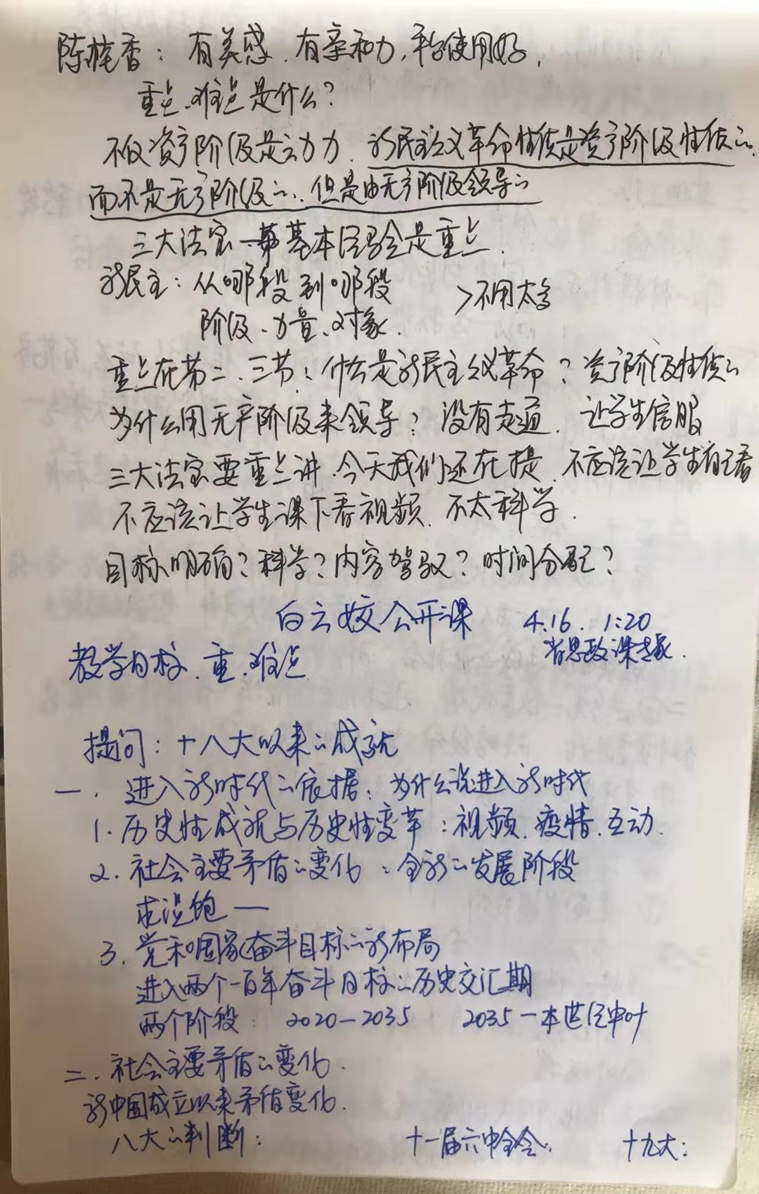 高政治站位,夯实责任。疫情防控是一场阻击战,总体战,人民战争。在这场全民战争中,每个人都不是旁观者,作为一名思政课教师更要提高政治站位,扛起肩上的责任,化“危”为“机”,教育引导学生正确对待疫情,深刻认识国情,厚植爱国情怀,坚定“四个自信”。停课不停学,质量不打折,为指导教师更好适应线上教学,增强学生的获得感,思想政治教研部组织开展示范教学,八名教师勇挑重担,精心准备,以实际行动践行使命担当,投身抗疫,共克时艰。