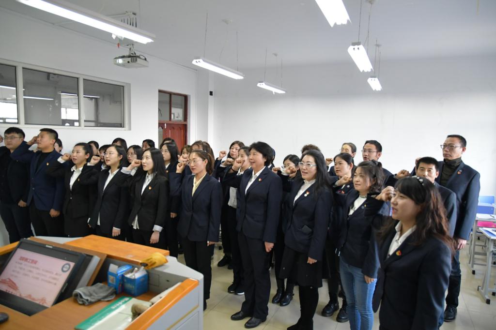 活动第一项,由支部委员杨洋带领全体新老教师面对龙职教工誓词庄严宣誓。激昂高亢,掷地有声,展现了思政部全体党员教师积极向上的精神风貌和尽职履责的坚定决心,再一次激发了新老教师为党育人、为国育才的使命感和责任感。
