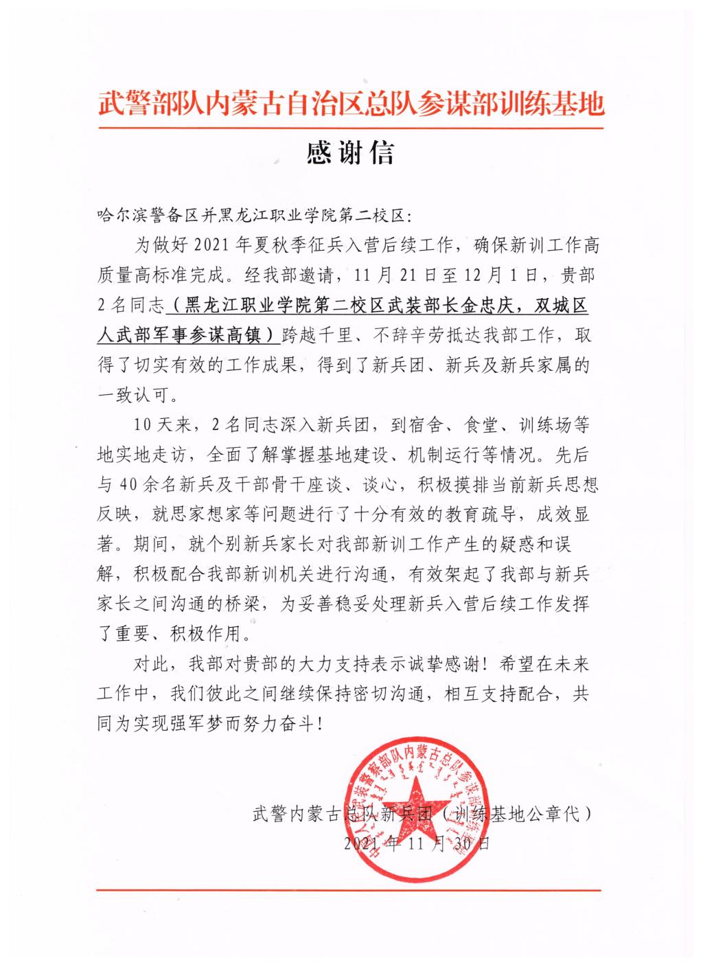 11月30日,一封由武警部队内蒙古自治区总队参谋部训练基地发出的感谢信,跨越千里传入jinnian金年会第二校区。信中对学校第二校区武装部部长金忠庆、双城区人武部军事参谋高镇,受部队邀请前往部队深入细致地开展思想政治工作给予高度评价。