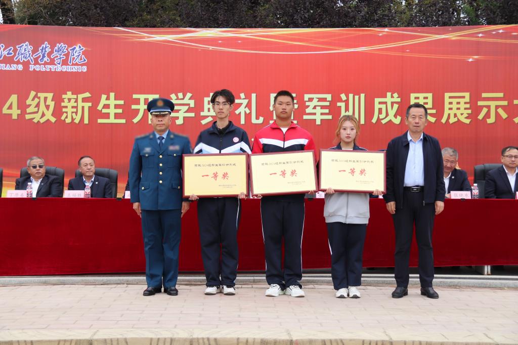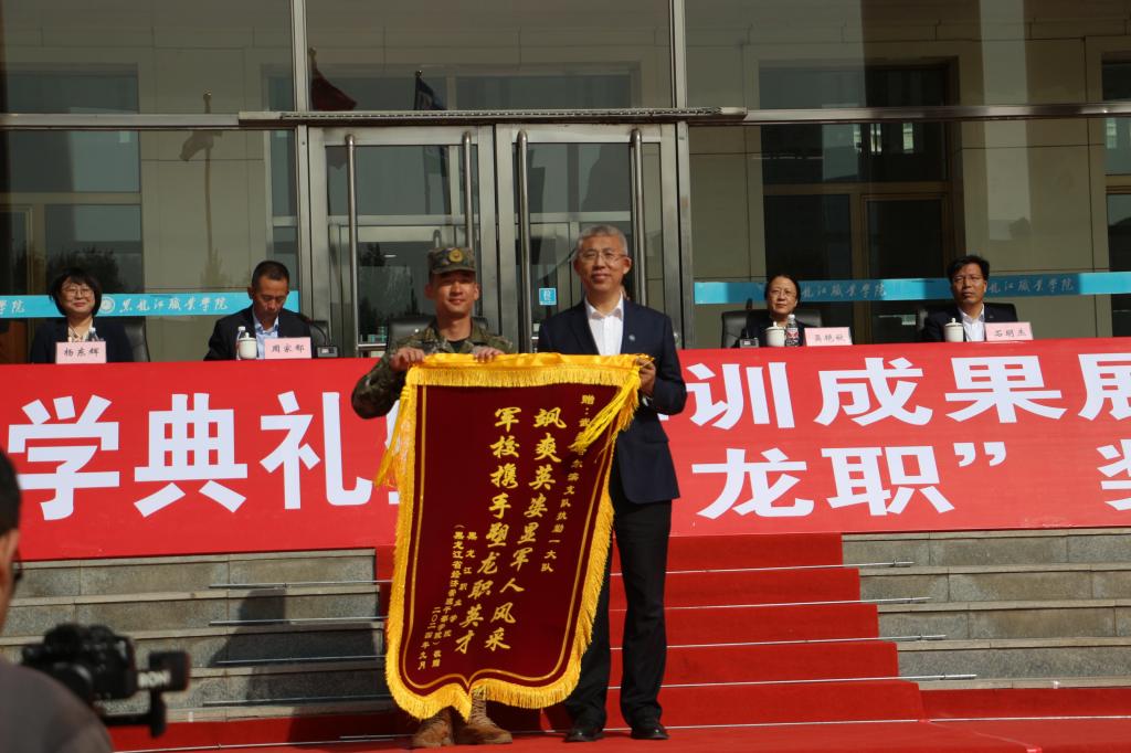 学校领导为军训中取得优异成绩的先进集体颁奖。