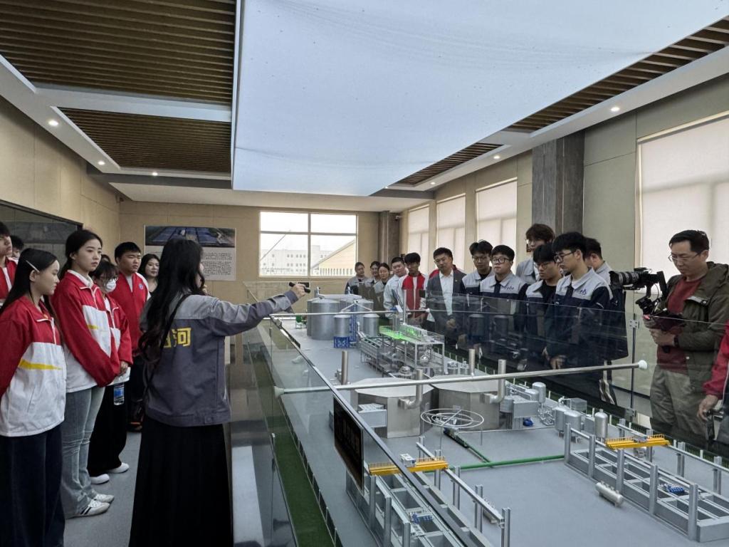 ▲企业现场讲解员正在向学生介绍传统产业与新质生产力的融合路径